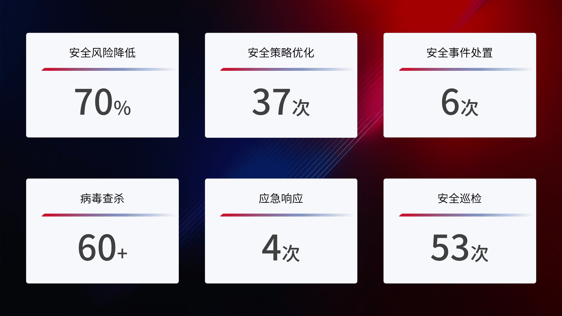 提供全面的安全事件报告体系,,,包括处置报告、、、、周报、、、、季度和年度总结,,结合持续监控,,帮助客户深入了解网络安全状况。。。。